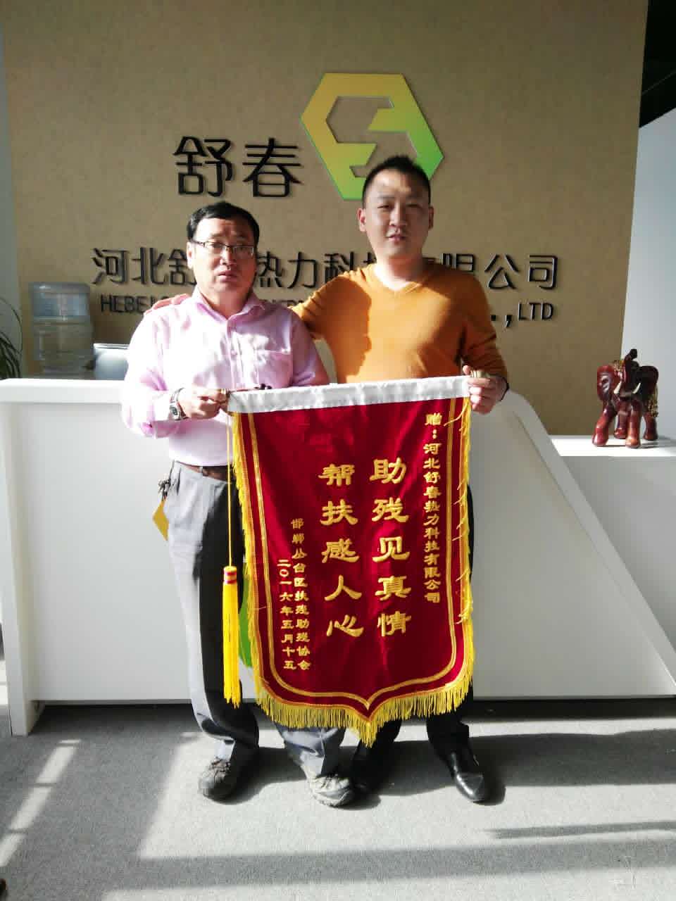 5月17日,邯鄲市殘聯肢殘人協會副主席、叢臺區(qū)殘聯肢殘人協會主席張鴻斌來到河北舒春熱力科技有限公司,親自送上錦旗,對河北舒春熱力科技公司的無償捐贈表示衷心的感謝。