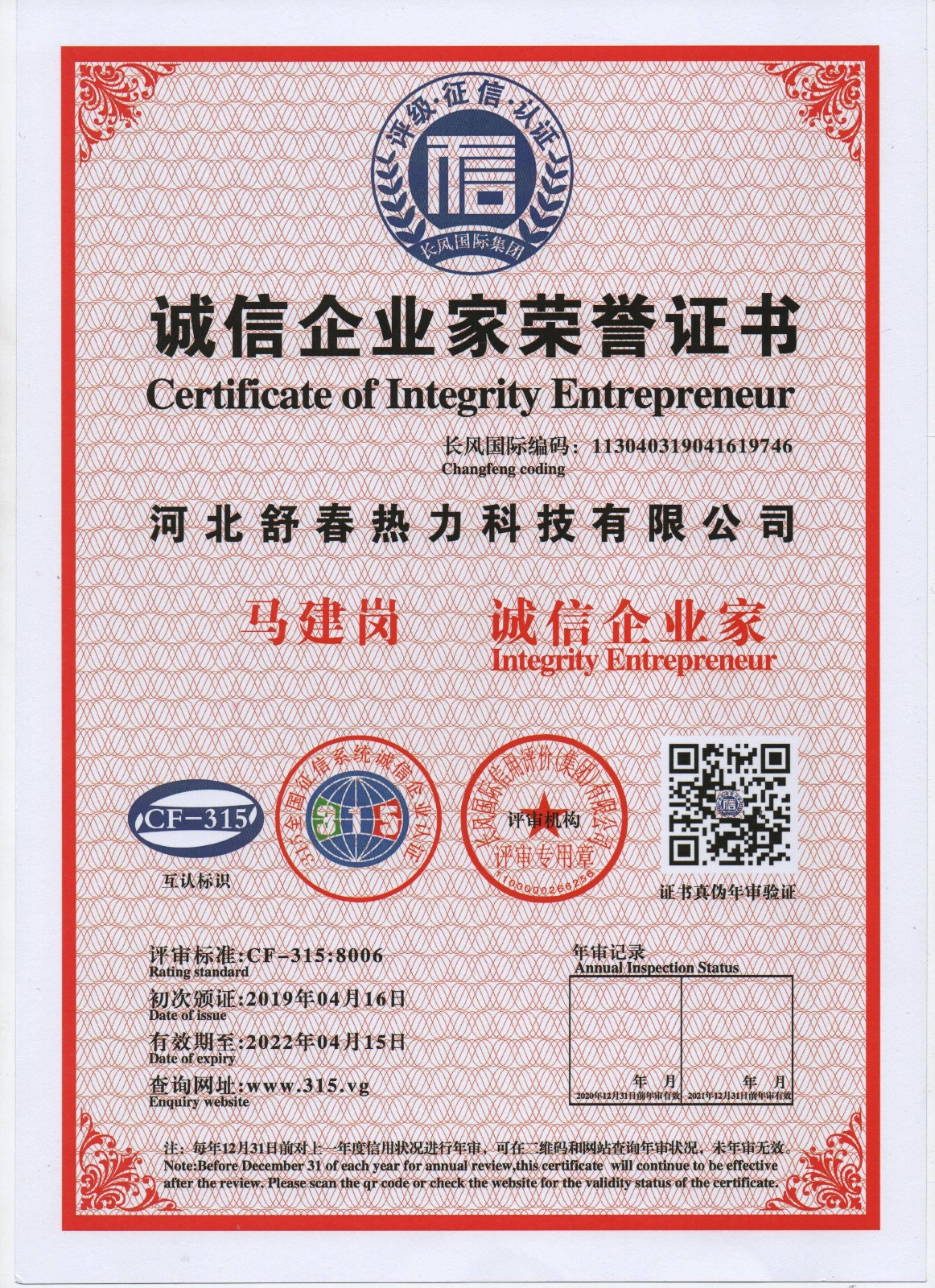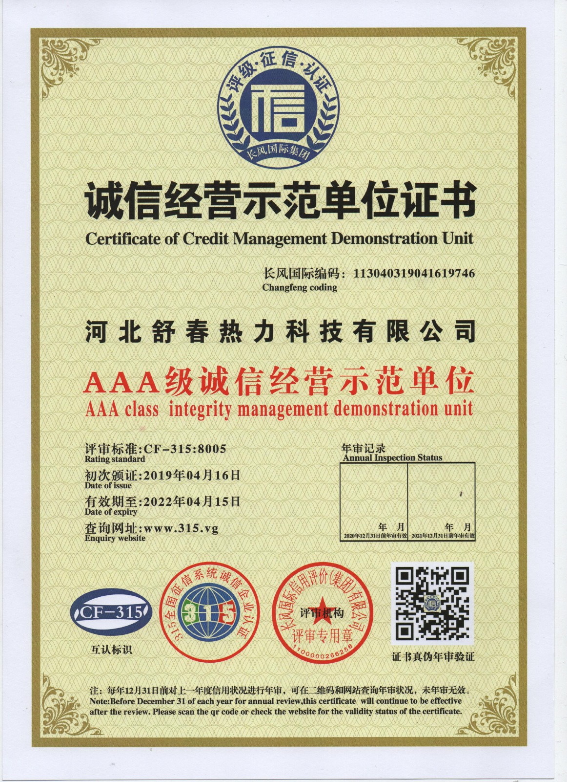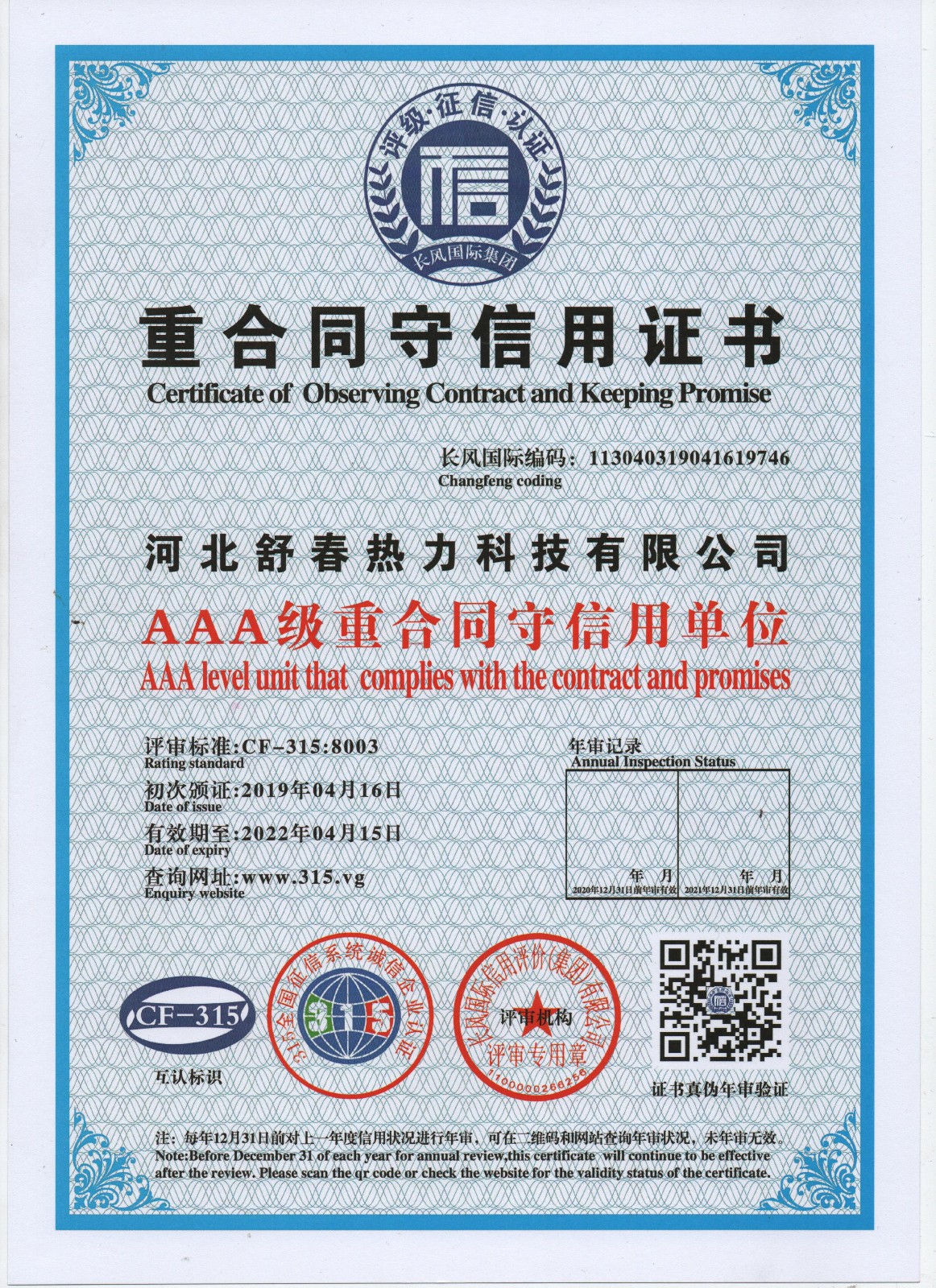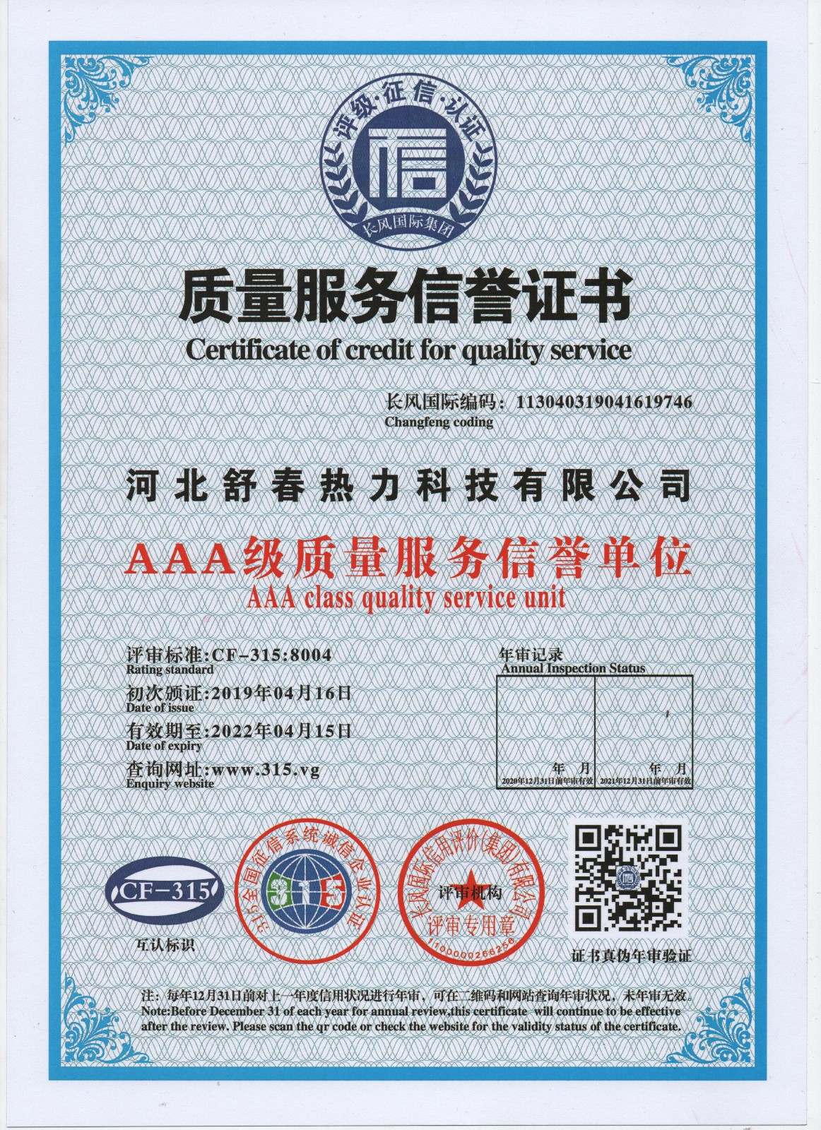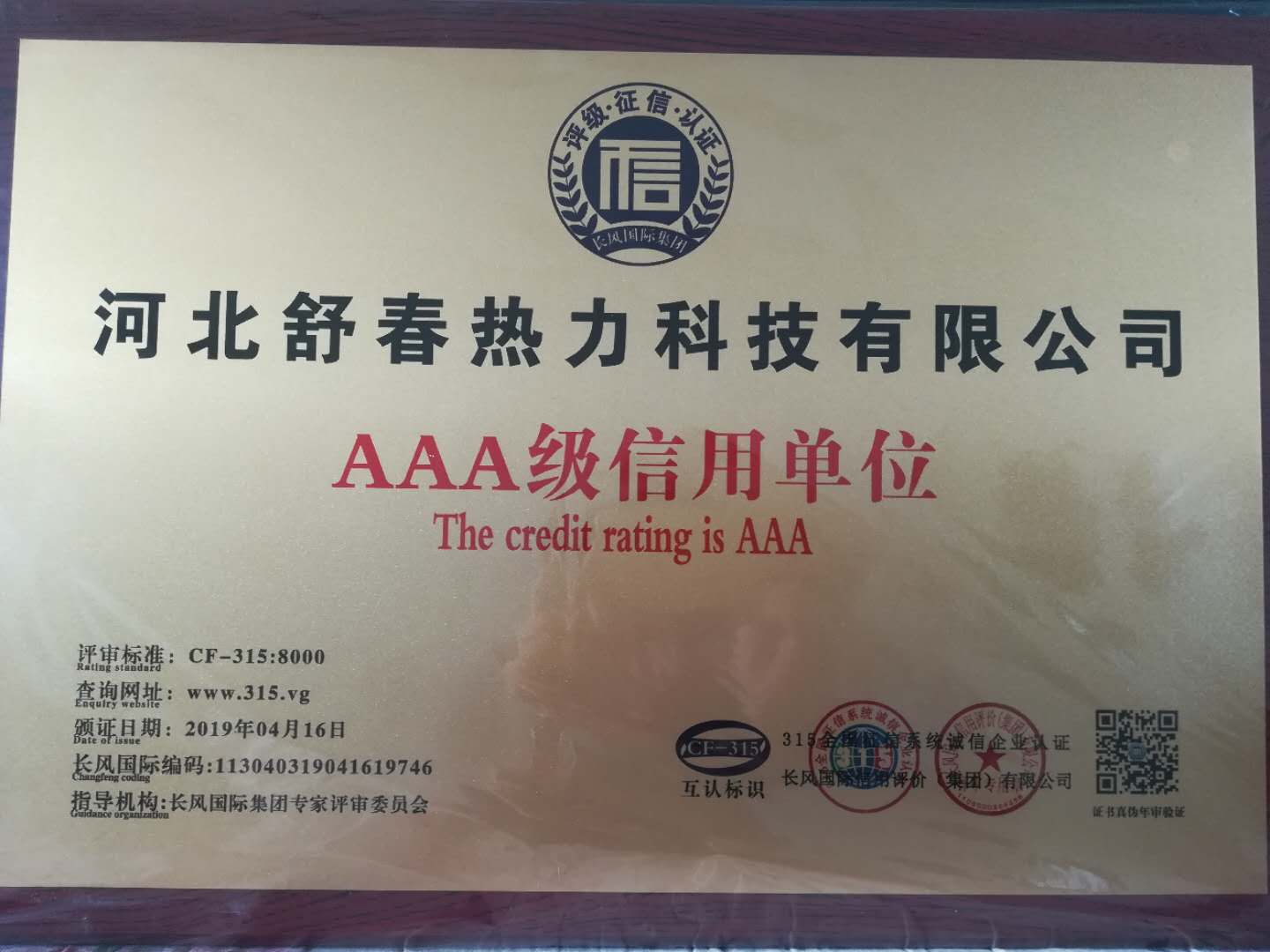 AAA級(jí)信用單位,舒春真誠(chéng)對(duì)待每一個(gè)人 2019年4月16日,河北舒春熱力科技有限公司取得了AAA級(jí)信用單位、誠(chéng)信經(jīng)理人、誠(chéng)信企業(yè)家、AAA級(jí)質(zhì)量服務(wù)信譽(yù)單位、 AAA級(jí)重合同守信用單位、AAA級(jí)誠(chéng)信經(jīng)營(yíng)示范單位、AAA級(jí)資信等級(jí)、AAA級(jí)信用等級(jí)。